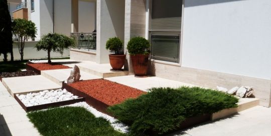 A este projecto foram aplicadas soluções de baixa manutenção, desenhando-se um jardim de entrada minimalista, com uma decoração centrada em materiais de revestimento como o seixo rolado, saibro e casca de pinheiro .